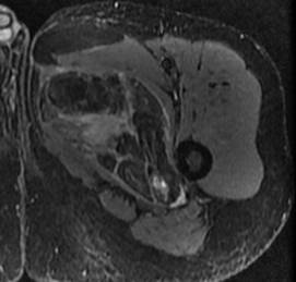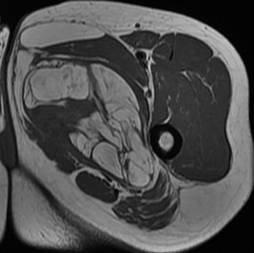 - En hypersignal T2 pseudo liquidien (tumeur myxoïde), d’aspect variable en T1