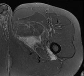 Liposarcome bien différencié. Noter la masse graisseuse, ayant une composante tissulaire (flèches) et des septas épais rehaussés après injection de gadolinium