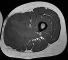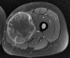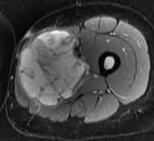 Histiocytofibrome malin. Noter l’aspect hétérogène en T2, avec prise de contraste hétérogène